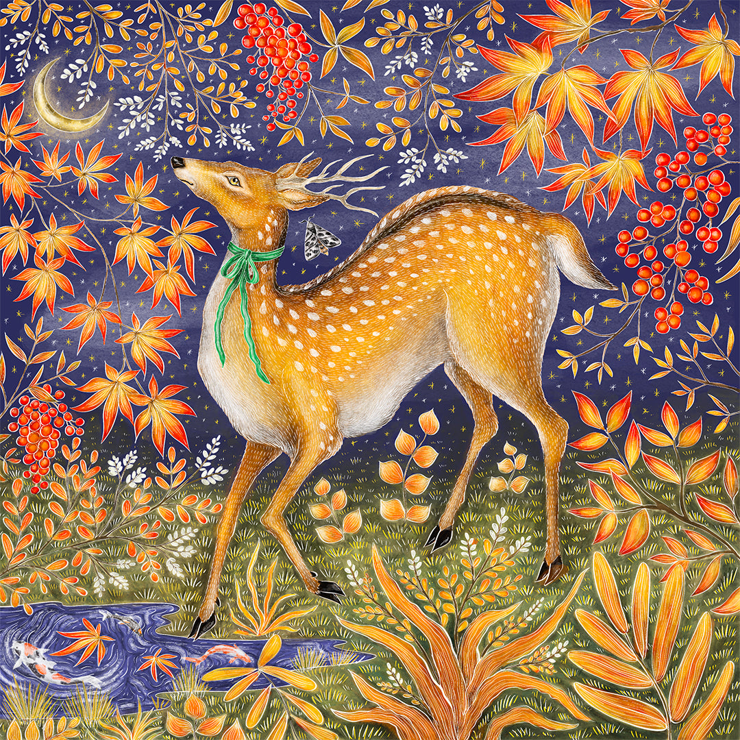'Aki', meaning 'Autumn' in Japanese, features a deer having a drink from a pool in Japan's famous Nara Deer Park. She is surrounded by beautiful autumnal foliage at dusk.