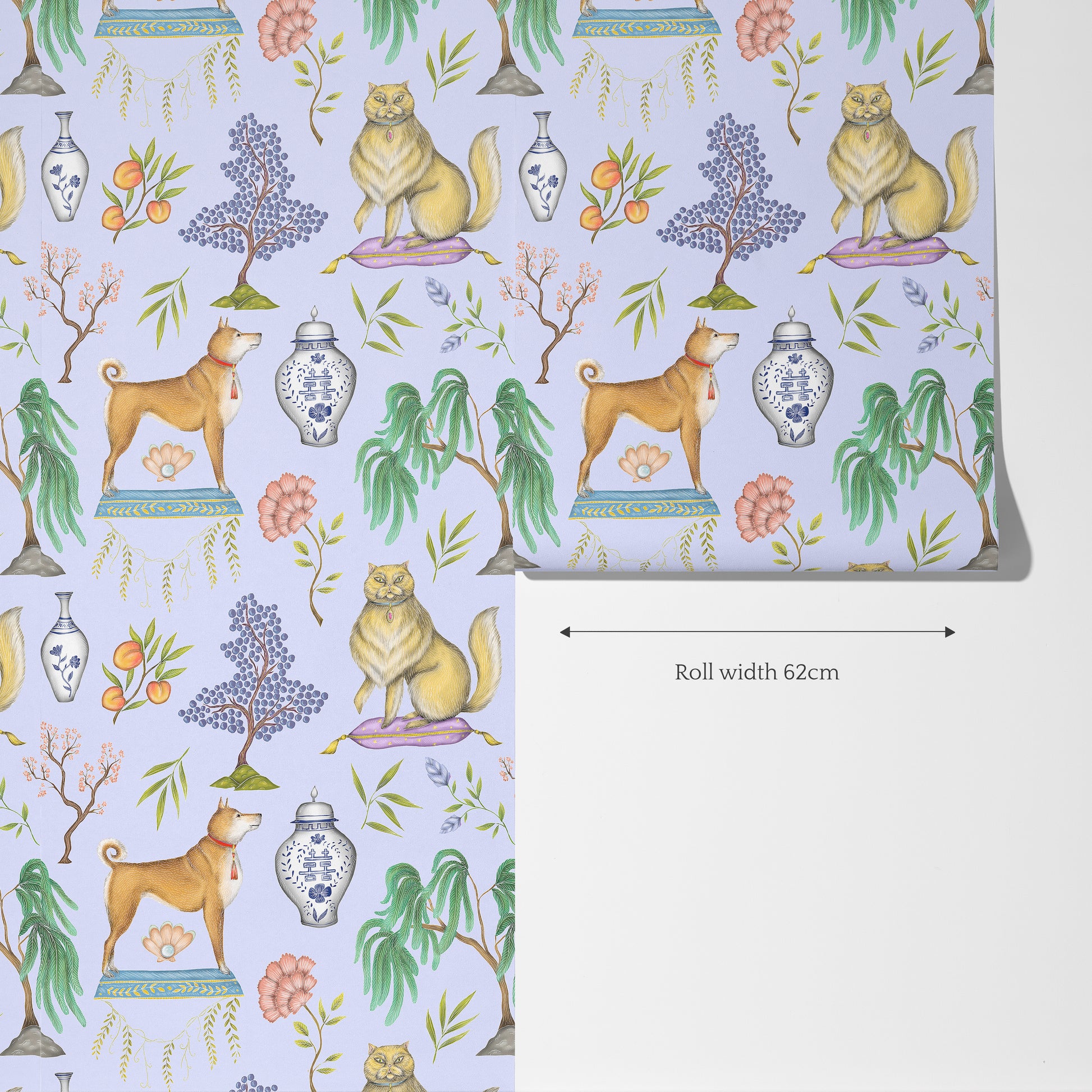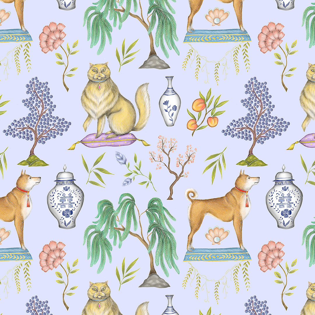 Inspired by Japanese Toile fabric, Chinoiserie Mengarie features a cute Shiba Inu and Persian cat - two of Catherine’s favourite dog and cat breeds.