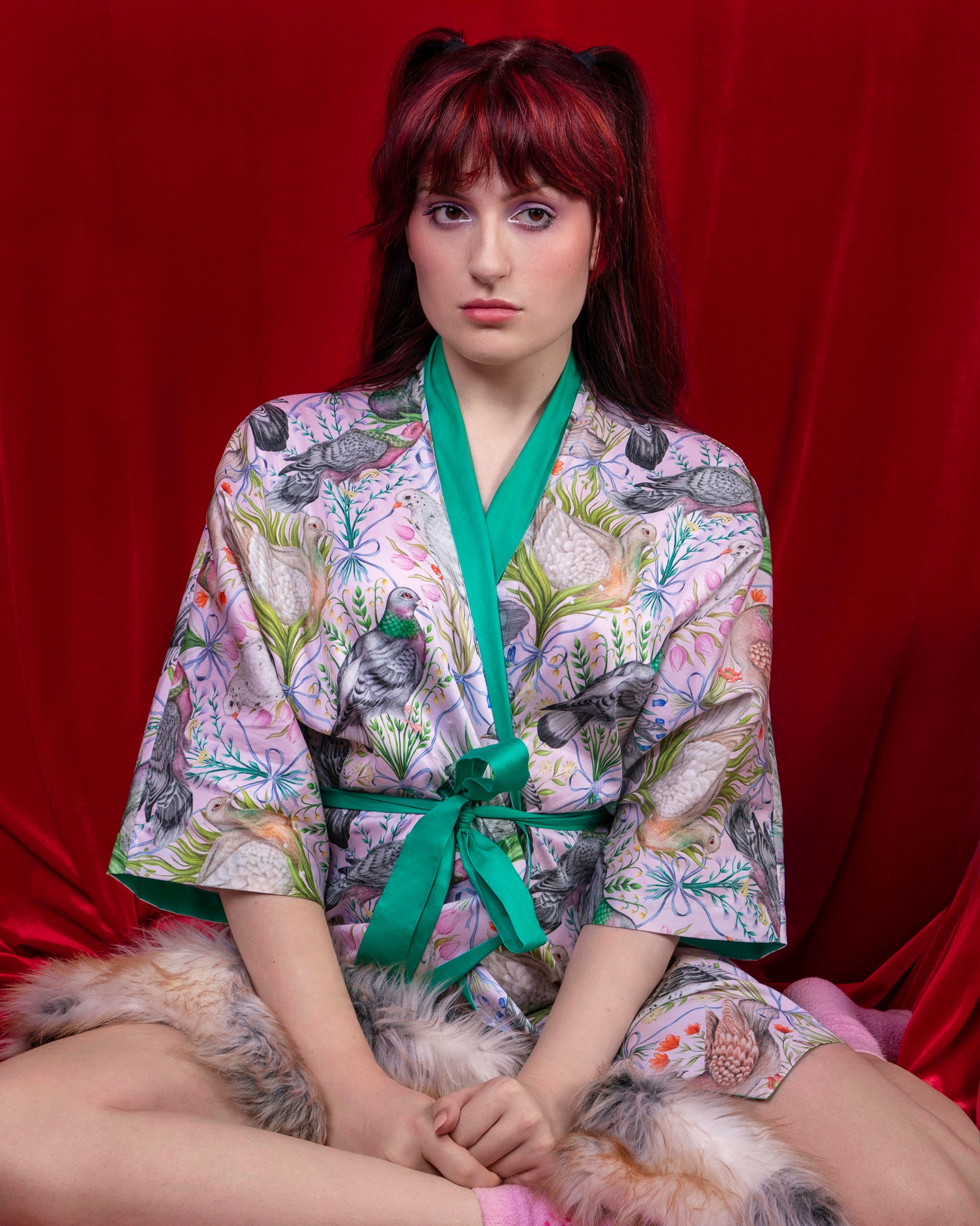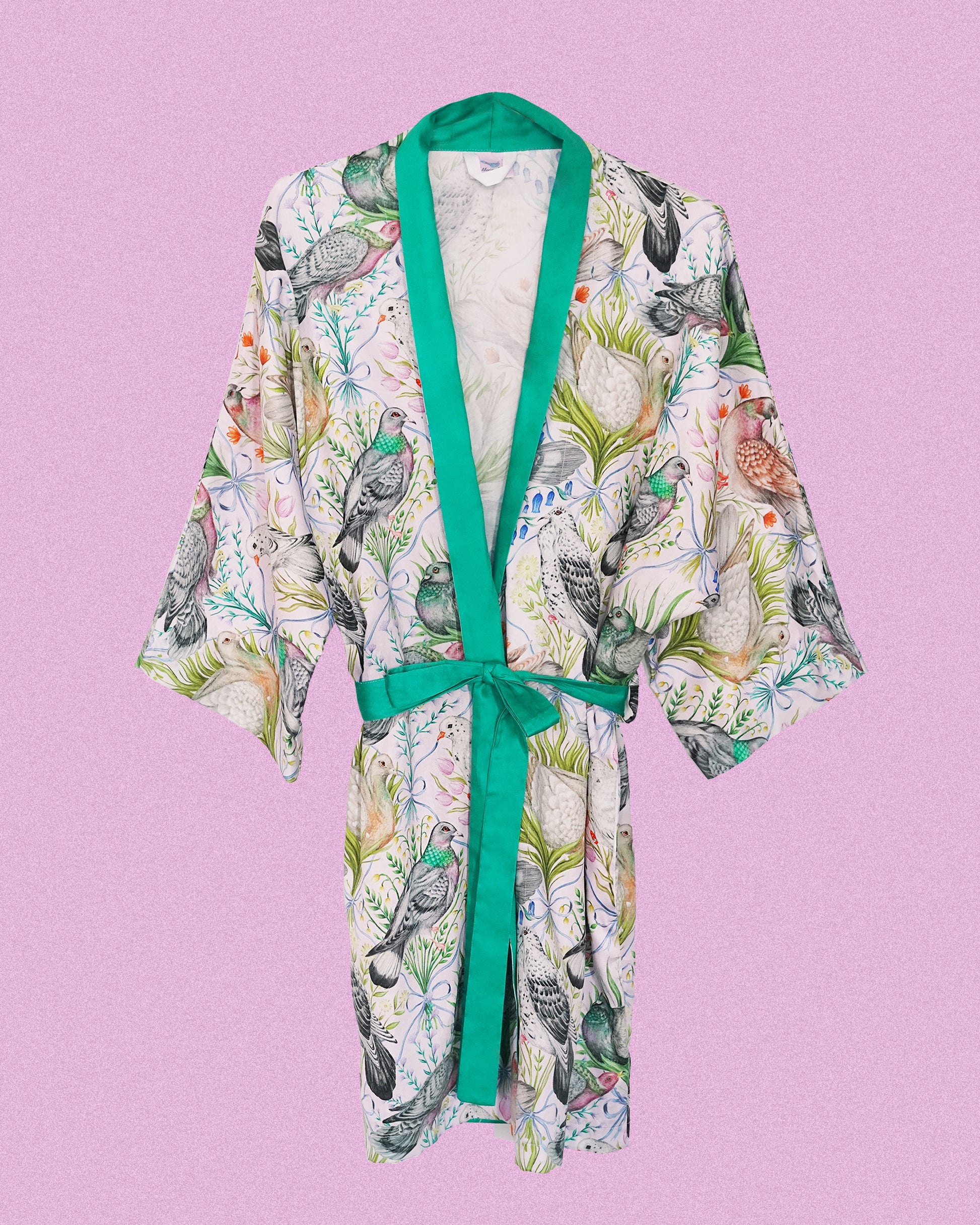 Adorned with Catherine Rowe's whimsical Pigeon Pals pattern, the robe features intricate hand-illustrated pigeons perched among vibrant foliage. The emerald green trim adds a striking contrast, echoing the jewel-like green feathers found in a pigeon’s plumage, creating a harmonious blend of art and nature.