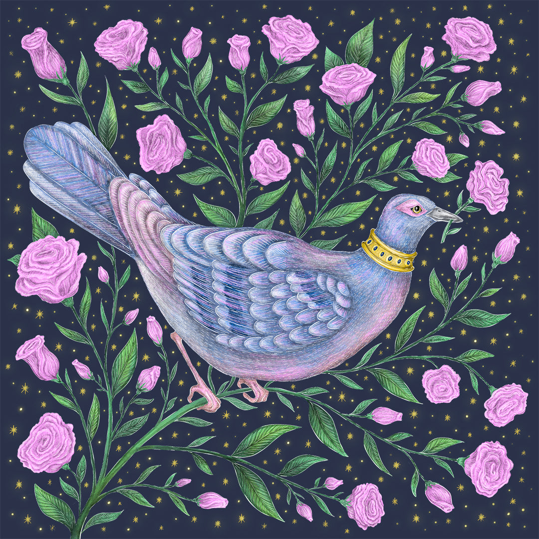 This captivating fine art print, titled "Tauben Rose," is a beautiful homage to Catherine's deep affection for pigeons and her family's heritage. Featuring a gracefully rendered pigeon adorned with a golden collar, the artwork showcases the bird amidst a delicate array of pink roses, symbolising Catherine's family name, "Rosenbaum," which translates to "rose tree." The roses represent resilience and strength, a poignant tribute to her family's history, especially the name change during WWII.