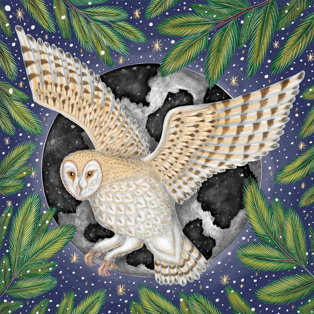 A majestic barn owl in mid-flight against a celestial backdrop.